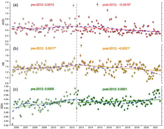 Linear (colored solid lines) and ESMD-based non-linear (blue dashed lines) seasonal varying trends of (a) AOD, (b) AE, and (c) SSA from 2006 to 2021 based on monthly averaged measurements. (* denotes the linear trends passing the 95% confidence level).