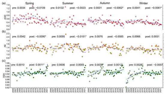 To reveal a detailed pattern of seasonal variations in aerosol optical parameters, linear and ESMD-based non-linear trends were derived using monthly averaged measurements directly. Figure 6a shows that the overall linear seasonal trends in AOD are consistent with the long-term variation directions, but the magnitudes of trends vary in different seasons. For AE, the linear seasonal trends are similar to the long-term variations, except in winter. There is an increase from 2013 to 2021 in winter, attenuating the substantial decline presented in other three seasons and leading to a moderate decrease in the annual trend in the post-2012 period. Similarly, descending variations in linear seasonal trends of SSA are observed in winter, which is different from the increasing pattern in other seasons.