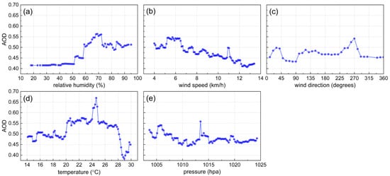 In this study, the measurements of the King’s Park weather station (22.3119°N, 114.1728°E, 40 m) were used, which is the closest to the PolyU AERONET station (about 1.2 km, red star in Figure 1b). The daily ground-level mean measurements can be acquired from the Hong Kong Observatory, including wind direction, wind speed, relative humidity, temperature, pressure and precipitation (https://www.hko.gov.hk/en/index.html accessed on 22 August 2022). Precipitation was not involved since the ground-level measurements of aerosol optical parameters are not available on rainy days. Additionally, to ensure accuracy and reduce uncertainties, the weather station records consistent with valid measurements of the PolyU AERONET site were extracted and used to explore the impacts of meteorological variables on AOD.