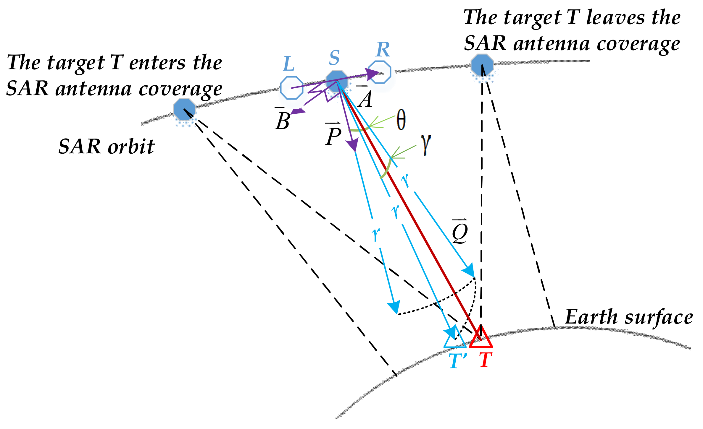 - Let . Suppose the satellite locates at point and at time and , respectively. Calculate the distances between the two points and T, respectively, and remove the near slant range to find the difference between the two .