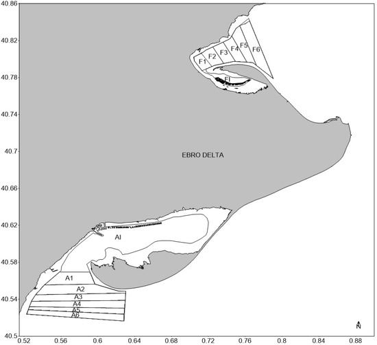 For the analysis and extraction of data from the generated images, QGIS 3.24 was used [74]. The area of interest corresponding to the masked images was divided into 2 different regions inside and outside the two coastal embayments (Figure 2). The studied area comprises 37.5 km2 inside and 37.8 km2 outside Alfacs Bay (southern area) and 2.7 km2 inside and 19.7 km2 outside Fangar Bay (northern area). The external area was divided into 12 polygons, 6 outside each embayment (Figure 2). The area inside each polygon was 5.5, 7.5, 7, 6.8, 4.8, 6.1 km2 for A1–A6 and 1.8, 2.5, 2.6, 2.9, 3.8, 6.1 km2 for F1–F6. Monthly chlorophyll-a concentration was averaged for each area of study, combining the available images for the period. The external areas were divided into different parts (polygons) to evaluate the gradient in chlorophyll-a concentration at different distances from the mouth of the bay. Each polygon was divided into three parts to evaluate the impact of the distance to the shore on the chlorophyll-a concentration.