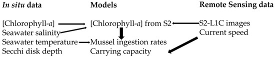 Carrying capacity was calculated by applying the recommendations of the Aquaculture Stewardship Council [80]. This standard provides indicators for a first approach to characterize the potential of an area. In the present study, the carrying capacity was defined as the number of rafts/ropes/mussels that can be grown in each area and was calculated as a function of the food availability measured through the chlorophyll-a concentration and the renewal time of the water masses. Chlorophyll-a concentration was obtained from the S2 images treated with the algorithm in this study, and the renewal time was calculated using the current speed at the different external areas.