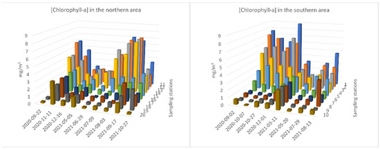 The results from the in situ measurements in October 2021 were not used for the calibration and validation of the satellite images but are included here to provide a wider view of the in situ environmental conditions of the area. The average depth of the 16 sampling stations was 7.7 ± 0.2 m (Mean ± Std. Error) and the range was 3.7–14.8 m. The average Secchi depth was 3.5 ± 0.2 m (Mean ± Std. Error) and the range was 1.3–10.4 m (Figure S1). The average chlorophyll-a concentration in the water samples was 2.4 ± 0.1 mg/m3 (Mean ± Std. Error) and the range was 0.1-8.9 mg/m3 (Figure 4). There was a statistically significant difference in chlorophyll-a concentration and Secchi disk depth (p ≤ 0.001) between the interior and the exterior sampling stations from the whole studied area (Kruskal–Wallis One Way Analysis of Variance on Ranks). In the southern area, there was no statistically significant difference in the mean values of chlorophyll-a concentration among the different sampling stations (p = 0.118) and dates (p = 0.251) (Two Way Analysis of Variance). In the northern area, there was a statistically significant difference (p ≤ 0.001) between sampling stations and dates.