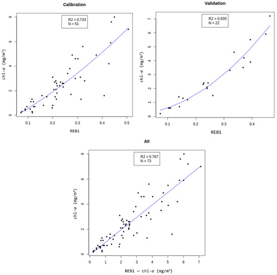 The calibration and validation plots, as well as the fit between observed and estimated chlorophyll-a concentration values, are presented in Figure 6.