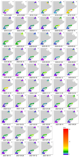 Maps of chlorophyll-a concentration from 56 different dates (Figure 7) along the period of study were generated using the methodology described in Section 2.3. A good agreement between estimated and observed chlorophyll-a concentration was observed within the sampling dates and the dynamic range of in situ data. However, unreliable high chlorophyll-a concentration was retrieved in some scenarios, such as the image of the 5 February 2020 (Figure 7), captured ~2 weeks after an extreme coastal storm. In those scenarios, dark brownish waters were visible in the RGB image composite, suggesting greater total suspended matter concentration and turbidity, leading to more optically complex waters.