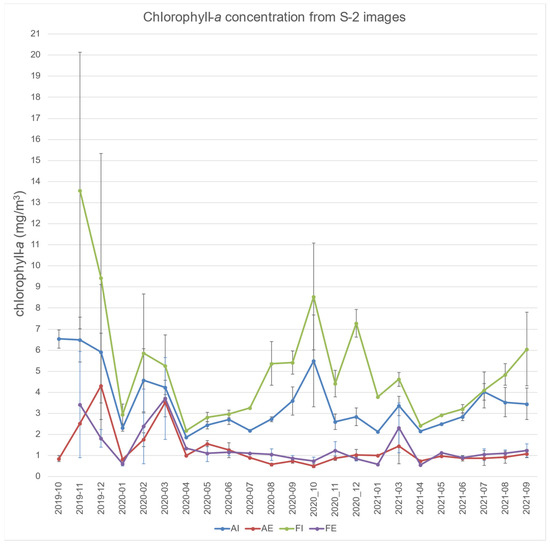 Maps of chlorophyll-a concentration from the area of study (October 2019 to September 2021) derived from Sentinel-2.