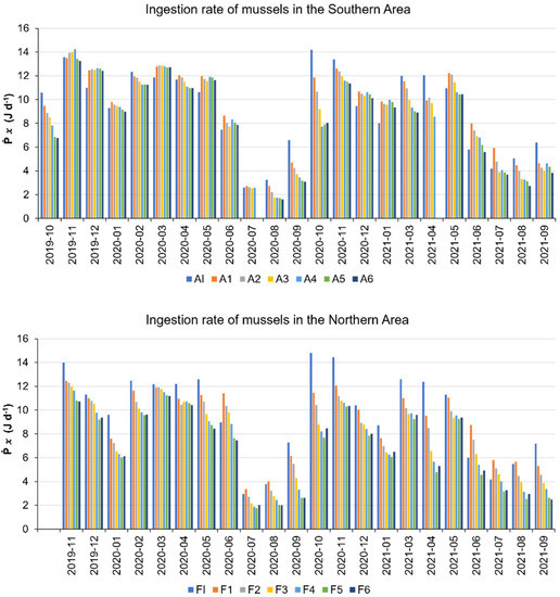 Ingestion rates () from October 2019 to September 2021 for the different polygons of the southern area and from November 2019 to September 2021 for the northern area are shown in Figure 9. In the external southern area, the mean value of was 8.7 ± 0.3 Jd−1 and the range was 1.6–14.2 Jd−1. The highest occurred from October 2019 to June 2020, when the range was 6.8–14.2 Jd−1; it decreased to values ≤ 8 Jd−1 from July to September 2020, increasing in October 2020 to values > 8 Jd−1 until May 2021, and decreasing again in June to September 2021 to values ≤ 8 Jd−1. In the external northern area, the mean value of was 7.7 ± 3.1 Jd−1 and the range was 1.7–12.5 Jd−1. In this area, the range was 6–12.5 Jd−1 from November 2019 to June 2020, decreasing to values < 6 Jd−1 from July to September 2020, increasing in October 2020 to values > 6 Jd−1 until May to June 2021, decreasing another time in July to September 2021. In both the northern and the southern area, there was a statistically significant difference (p ≤ 0.001; Two Way Analysis of Variance, General Linear Model) among the values for different dates and polygons.