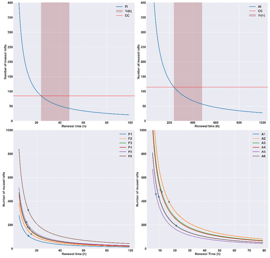Modeled number of rafts that each area can hold depending on the renewal time (h). The interior areas (FI, AI) are shown at the top of the image and the external areas (F1–F6, A1–A6) at the bottom. The horizontal red line represents the carrying capacity (CC) calculated for the average renewal time in hours (Tr) of the areas (FI, AI). The shaded area in FI, AI corresponds to the average renewal time of each embayment. The dots on the lines at the bottom of the figure correspond to the CC calculated for the average renewal time of each external area (F1–F6, A1–A6).