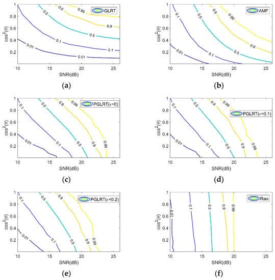 In Figure 4, the probability of detection () as a function of is plotted to analyze the gradient detector’s mismatched detection performance when and . In Figure 5, the contours of of the detectors as a function of and when is plotted. It can be seen that compared with the PGLRT, Wald, AMF, and Kelly’s GLRT, the proposed gradient detector is more robust when the signal mismatch occurs. Compared with the robust Rao detector, the proposed gradient detector achieves better robustness when .