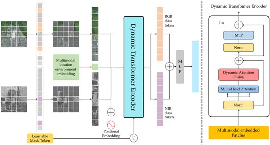 Specifically, in the potential embedding extraction of aerial images, the multimodal aerial images of the RGB and NIR are input into the transformer encoder model with the Learnable Mask Token (LMT), respectively. The mask token has learned the attention weight. Then, we mask the low-weight patches to extract the latent representations of the local regions with high attention weights. At the same time, the location environment embedding by multi-layer perceptron (MLP) is added to the process of extracting the latent representation and fused with the token with high attention weights to improve the distinguishability of the aerial images’ latent representation by the dynamic attention fusion (DAF) model. Finally, the enhanced latent representations by additional location environment embedding of RGB and NIR images are fused for multimodal species recognition. We evaluated DViT on the GeoLifeCLEF 2021 and 2022 datasets, achieving state-of-the-art performance.