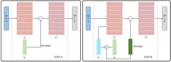 In this section, we first describe the elementary implementation of our proposed dynamic attention fusion (DAF-A) model and its improved variant DAF-B. Inspired by dynamic filters [,,,], we propose a DAF model that introduces multimodal location environmental embedding, , into the visual transformer encoder adaptively to enhance the distinguishability of aerial image representations. In Figure 3 on the left, we show a single unit of DAF-A, the most concise implementation of DAF-A. The classification process is as follows: