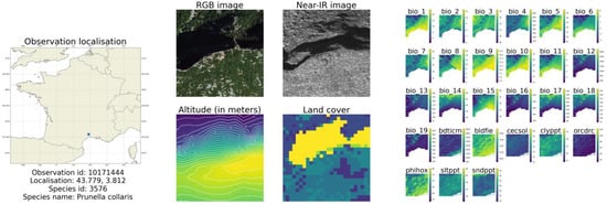 - Lorieul, T.; Cole, E.; Deneu, B.; Servajean, M.; Joly, A. Overview of GeoLifeCLEF 2022: Predicting species presence from multi-modal remote sensing, bioclimatic and pedologic data. In Proceedings of the Working Notes of CLEF 2022-Conference and Labs of the Evaluation Forum, Bologna, Italy, 5–8 September 2022. [Google Scholar]