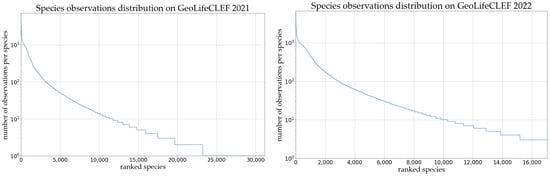 Due to the category imbalance of the species recognition dataset, the visualization of species observation distribution in the two datasets is shown in Figure 6. It can be seen that the long-tailed distributions problem of the GeoLifeCLEF 2021 dataset is more obvious. This dataset includes 31,179 observed species and only species category labels are given. The 17,037 observed species in the GeoLifeCLEF 2022 removed species categories with a small sample from GeoLifeCLEF 2021; this includes 9080 plants and 7957 animals. The species, genus, family, and kingdom category labels are also given for each observed data sample.