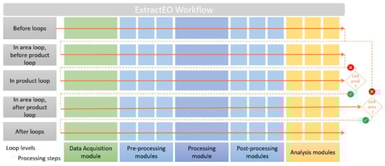 EEO is a software implementing fully automated, end-to-end satellite data processing chains. Its plugin-oriented design enables easy maintenance (module-by-module) and easy evolution (removing and adding modules shouldn’t affect others). Every module should implement core functions that are run in a predefined order by the EEO runner. EEO first splits the work into areas (AOI, Sentinel-2 tiles, etc.) which are themselves split into the individual constituent satellite products. This workflow is summarized in Figure 2. The design paves the way for parallelized and distributed computing. The chains are configured through a configuration file, enabling the operator to use predefined chains or create/customize chains, in order to fine-tune module configuration according to the monitored area. So even if the chains are fully automated, the operator can still bring expertise to bear that ensures better results, thanks to fine-tuning.