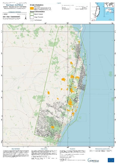 In the last few years, SERTIT has developed and operationally implemented a Sentinel-2- and Landsat-8-based fire mapping pipeline that sources the imagery and extracts burnt areas. The system requests the optimal days from which to extract the burnt area layer. The layers are then rapidly verified by experienced operators before integrating crisis mapping databases and delivery to users. This pipeline was applied to vast areas in eastern Australia during the 2019–2020 fire season to test the system, and was well suited to mega-fire mapping.
