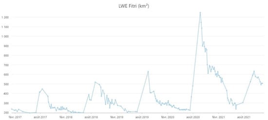 The EEO pipeline downloaded 299 Sentinel-2 images acquired from 2017 to 2021 covering Lake Fitri. The lake surface was calculated on each exploitable date (i.e., no clouds over the lake) from all lake masks. Then, the results fed the LWE curve illustrated in Figure 8. The variations of the lake’s surface were impressive, with a minimum surface of 194 km² and a maximum surface of 1249 km² over the observed period. Moreover, the dynamics of the water surfaces were similar for the years 2017, 2018, and 2019. In 2020, the huge rise in the LWE was significant, as the 2020 maximum extent corresponded to double the maximum LWE observed during the three previous years.