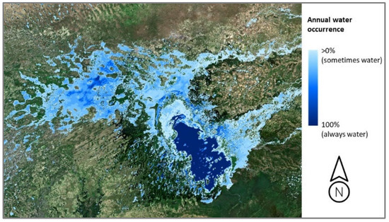 Occurrence products were also derived from the lake masks, including annual occurrence (illustrated in Figure 9 for 2020) and overall occurrence over the 4-year observation period. These maps were very useful in helping to understand the lake’s inter- and intra-annual dynamics, with the results offering very rich information for the study and management of this lake. A regular monitoring of Lake Fitri’s LWE variation, in addition to rainfall, would provide excellent indicators of climate trends in this poorly studied region, as well as stresses on the resources in the context of population growth and stability/security. This was a success for EEO in terms of automatically deriving high quality water and cloud masks over a time series (from Sentinel-2 and Sentinel-1), computing areas to build a LWE monitoring curve and, compiling occurrence products. Details and maps are available through a dedicated ArcGIS Story Map [28].