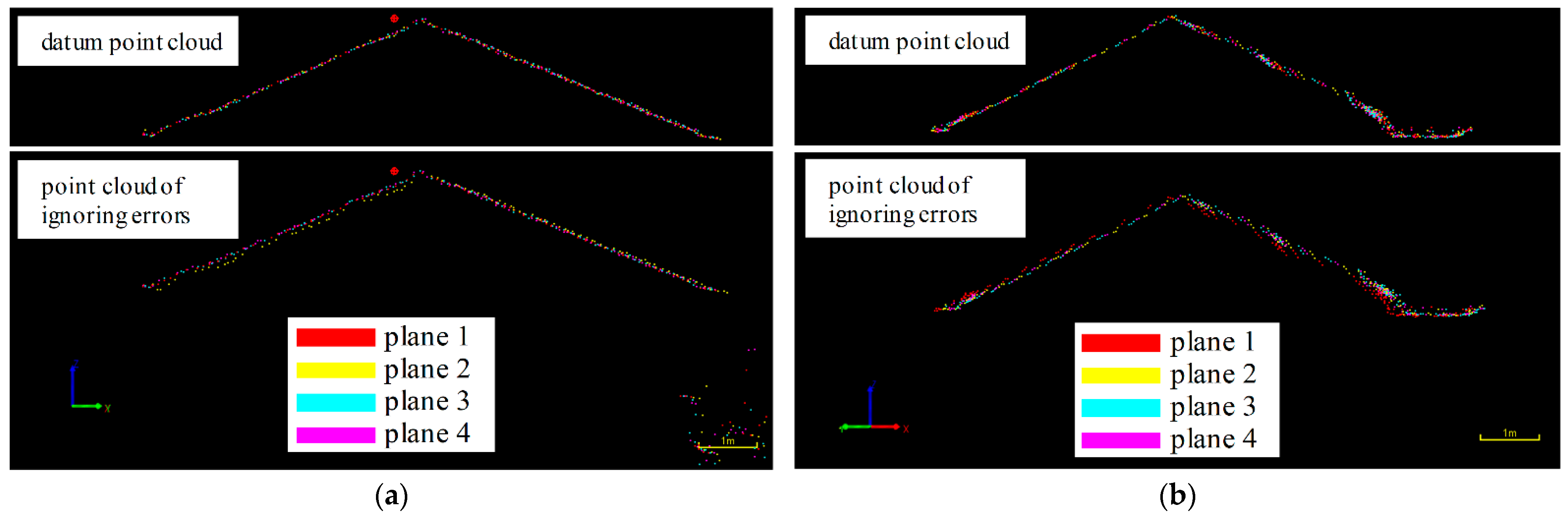 - According to the influence of on the point cloud, use to rotate the point cloud in the pitch direction, and then make , so as to ensure that the ground objects in flight 2 and flight 3 in Figure 11 coincide. Thus, the process of correcting the point cloud of multi-strip by using the installation angle when is ignored is simulated. Then, by , and , the coordinates of point in the point cloud are calculated as ;