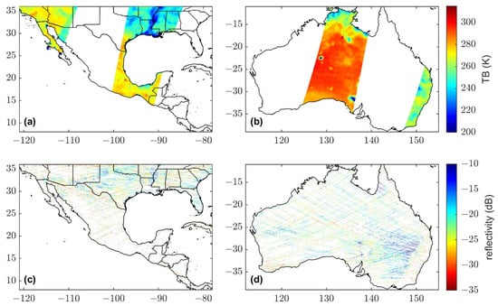 9 km SMAP brightness temperatures (TBs) over (a) southern North America and (b) Australia, and CYGNSS reflectivity gridded at 3 × 3 km over (c) southern North America and (d) Australia on 9 March 2020.