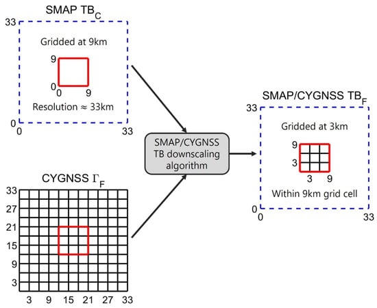 In an effort that follows the SMAP mission’s original plan to downscale radiometer TB retrievals using radar retrievals, we downscaled SMAP TBs using CYGNSS reflectivity values. SMAP’s original active-passive algorithm includes cross-polarization data, which is not available from CYGNSS retrievals. We therefore used a slightly modified version of the baseline SMAP active-passive TB algorithm (Equation (3)) with no cross-polarization measurements []. This algorithm merges coarse-scale (33 km, gridded at 9 km) SMAP TBs with fine-scale (3 km) CYGNSS reflectivity values to create fine-scale (3 km) SMAP/CYGNSS TBs, as depicted in Figure 2.