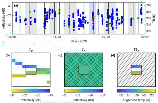All displayed data falls within the 33 km box centered on the 9 km grid cell at [31.2N, 98.7W]. In (b–d), the black borders are the 33 km box and the red squares are the 9 km grid cell. (a): A month-long timeseries of collocated SMAP and CYGNSS data, where each temporal collocation period is ±half the time between successive SMAP observations. The black lines denote the time of each SMAP observation, and the alternating gray and white shaded regions show the temporal collocation periods. The blue shaded region shows the collocation period depicted in (b–d). The green squares are SMAP observations. The blue dots are CYGNSS observations. The red diamond is the value shown in (c). (b): The map shows all the CYGNSS reflectivity values collocated with the SMAP observation on 17 February 2020. (c): is the median of all and is used to calculate within the central 9 km grid cell. (d) The map shows the 3 km SMAP/CYGNSS TBs calculated using the displayed and values.