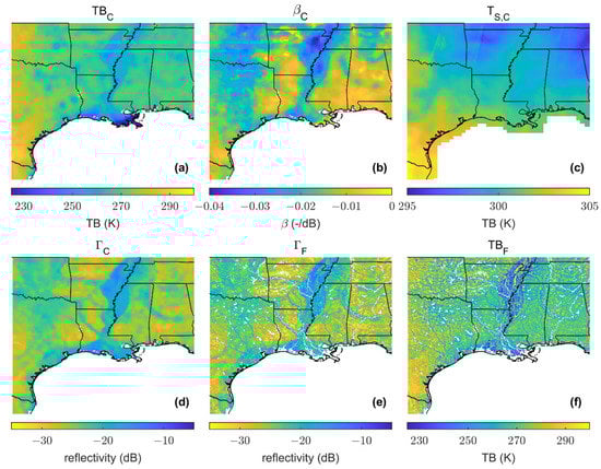 Regional maps [25–37N, 85–99W] of all the parameters in the SMAP/CYGNSS TB algorithm. Each map is an aggregation of data from 1 June through 15 July 2020. (a) 33 km SMAP enhanced TB (gridded at 9 km), . (b) Slope of the linear regression between SMAP emissivity and CYGNSS reflectivity, . (c) Effective surface temperature, . (d) 33 km CYGNSS reflectivity (gridded at 9 km), . (e) 3 km CYGNSS reflectivity, . (f) 3 km SMAP/CYGNSS TB, .