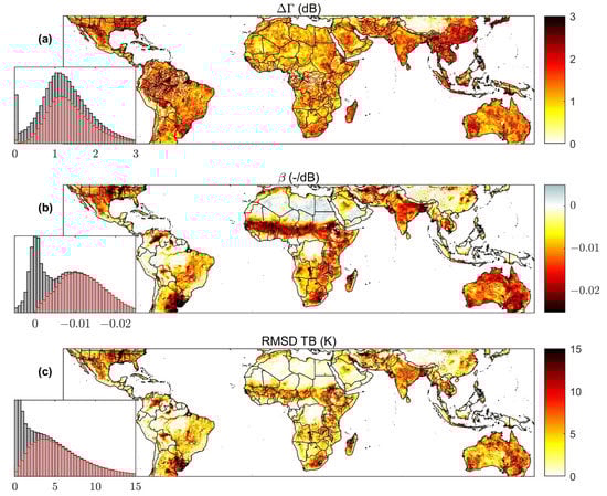 (a) Map and histograms of median ΔΓ values (described in Section 3.2), calculated using data from 2020. (b) Map and histograms of SMAP/CYGNSS β values (described in Section 2.2.2). (c) Map and histograms of the median RMSD between 9 km SMAP TBs and 3 km SMAP/CYGNSS TBs (described in Section 3.1), calculated using data from 2020. Gray histograms include all data. Red histograms only include data for 9 km grid cells with β values where R < −0.4 (Section 4.3).