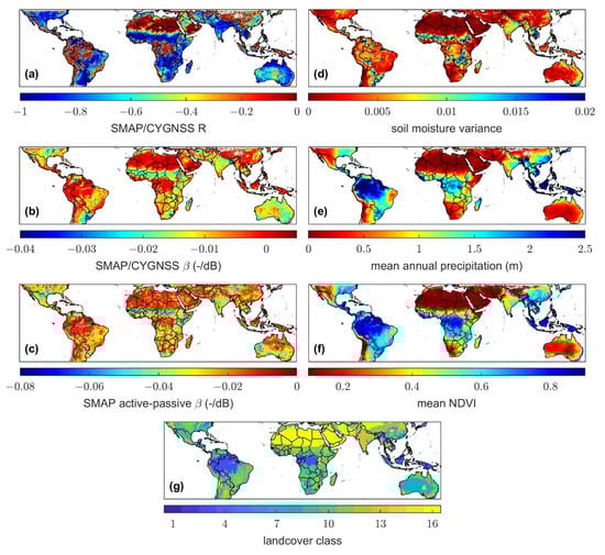 (a) Correlations for 45-day SMAP emissivity and CYGNSS reflectivity linear regressions (β values). (b) SMAP/CYGNSS β values. (c) SMAP active-passive β values. Mean of daily SMAP β (K/dB) divided by daily Ts (K) from 15 April 2015–7 July 2015 []. (d) NSSM variance, calculated using 9 KM SMAP soil moisture data from 2020. (e) Mean annual precipitation, calculated using FLDAS precipitation data (described in Section 2.3). (f) Mean NDVI, calculated using MODIS/Terra data (described in Section 2.3). (g) 2020 MODIS IGBP landcover class. A landcover class key is included in the second figure in Section 3.3.1.