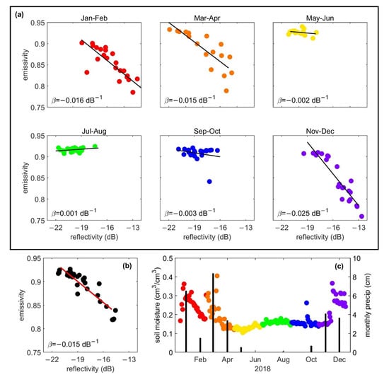 With more than five years of coinciding CYGNSS and SMAP data, there are sufficient collocated time-series data to calculate β statistically. As described above, β is the spatially varying slope determined via linear regression between SMAP emissivity and CYGNSS reflectivity values. We chose to use emissivity, rather than TB, because TB is affected by surface temperature, which fluctuates seasonally.