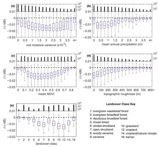 The number of 9 km grid cells (n-values) used to calculate each boxplot are included above each subplot. (a) Relationship between SMAP/CYGNSS β values and annual SMAP NSSM variance. Each boxplot spans a NSSM variance range of 0.0025. (b) Relationship between SMAP/CYGNSS β values and FLDAS mean annual precipitation. Each boxplot spans a precipitation range of 0.25 m. (c) Relationship between SMAP/CYGNSS β values and MOIDIS/Terra mean NDVI. Each boxplot spans an NDVI range of 0.05. (d) Relationship between SMAP/CYGNSS β values and SRTM topographic roughness. Each boxplot spans a topographic roughness range of 50 m. (e) Relationship between SMAP/CYGNSS β values and MOIDIS IGBP landcover class.