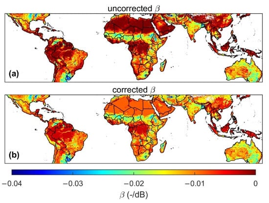 (a) Uncorrected SMAP/CYGNSS β values. (b) Corrected SMAP/CYGNSS β values for 2020. All β values with R > −0.4 were replaced with representative β values, based on the median β values of the MODIS IGBP landcover classes.