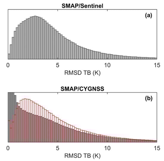 (a) RMSD between 3 km SMAP/Sentinel TBs and 9 km SMAP TBs. (b) RMSD between 3 km SMAP/CYGNSS TBs and 9 km SMAP TBs. Gray histogram TBs were calculated using uncorrected β values. Red histogram TBs were calculated using landcover class corrected β values. The remaining zero-value RMSD TBs in the β-corrected histogram are due to ΔΓ values of zero, which occur when is calculated using a single CYGNSS reflectivity value (Section 4.6.1).