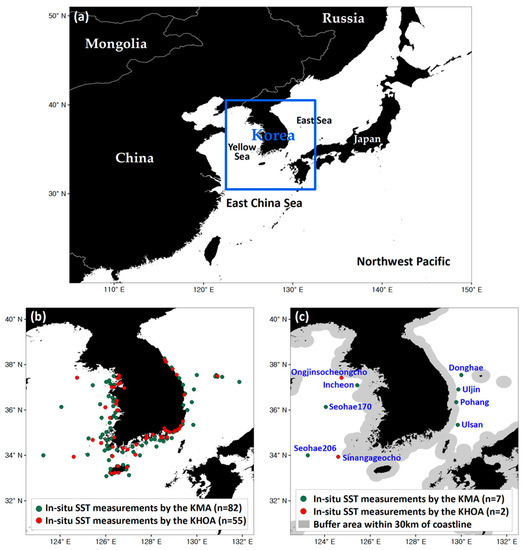The study area is around the Korean Peninsula between 30.5°N to 40.5°N and 122.5°E to 132.5°E. Figure 1a shows a map of East Asia including the study area. Figure 1b shows the locations of the 137 in situ SST measurements by the Korea Meteorological Administration (KMA) and the Korea Hydrographic and Oceanographic Agency (KHOA) used for the reference data. Green points are the locations of 82 KMA stations, and red points denote the locations of KHOA stations. They are used as reference data for the validation of GK2A SST gap-filling. Figure 1c shows the locations of nine stations used for the performance evaluation, particularly for the far seas more than 30 km from the coastline (Ongjinsocheongcho, Incheon, Seohae 170, Seohae 206, Sinangageocho, Ulsan, Pohang, Uljin, and Donghae).