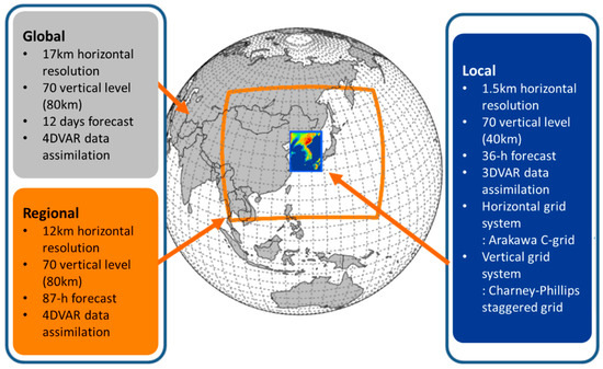 LDAPS data were used as explanatory variables of our spatial gap-filling model for the invalid pixels of the GK2A daily SST product. LDAPS is based on the unified model (UM) designed by the United Kingdom (UK) Met Office. LDAPS produces a local-scale forecast and reanalysis around the Korean Peninsula and helps overcome the spatial resolution and time-scale limitations of the global and regional models. The data is provided eight times (00, 03, 06, 09, 12, 15, 18, and 21 UTC) per day on a 1.5 km grid for the 70 vertical levels up to 40 km [30] based on a three-dimensional variational (3DVAR) data assimilation technique [31] (Figure 2). Table 3 shows the candidates for the explanatory variables from LDAPS for our SST gap-filling: specific humidity, air temperature, skin temperature, relative humidity, maximum wind speed, and precipitation. The eight-times data were aggregated as daily averages to match the GK2A daily SST.