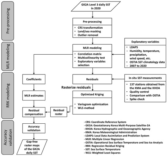 Meanwhile, recent advances in satellite remote sensing have enabled multiple geostationary satellites worldwide, covering America, Europe, and Asia. The Geostationary Korea Multi-Purpose Satellite-2A (GK2A) was launched on 5 December 2018, and has been providing various meteorological products, including SST, at intervals of 10 min on a 2 km grid [25]. However, a spatial gap-filling method to create continuous raster data is not established yet. The objective of this study was to develop a spatial gap-filling framework for GK2A daily SST using RRK for the seas around the Korean Peninsula. It is the first challenge for the SST from geostationary satellites that can minimize the uncertainty of the SST estimate using RRK by residual compensation. For quality control, extreme outliers were removed from the in situ measurements and the satellite images for SST by using statistical procedures. Then, a regression model was built for the valid SST pixels using multiple meteorological variables. The irregular point residuals from the regression model were converted into a raster surface by optimized kriging for use in the residual compensation. The regression estimates calculated for the invalid SST pixels were then corrected by the residual compensation. The accuracy statistics of the proposed gap-filling method by RRK were presented to show the performance of our approach for the high-quality gap-free raster map of daily SST.