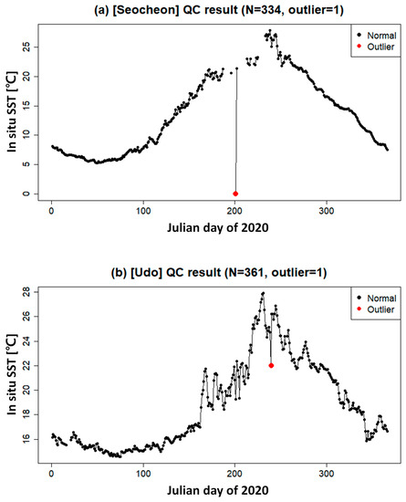Example of quality control results for in situ SST observations at (a) Seocheon and (b) Udo. The black point denotes the normal data of the time series, and the red point is the outlier detected by the quality control process.