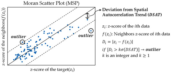 The CRS of GK2A SST was converted from Lambert conformal conic (LCC) to World Geodetic System 1984 (WGS84) for the CRS unification of all data needed for the matchup database. We distinguished the sea pixel using a land/sea mask created from an electronic navigation chart (ENC) provided by the KHOA. Outlier detection was also conducted for the GK2A SST that may be contaminated by cloud or land pixels [39]. We detected extreme outliers showing very different values from the neighboring pixels [40,41] using the deviation from spatial autocorrelation trend (DSAT) method [42]. Usually, the similarity of data values increases as the distance of the locations decreases [43]. Such a spatial autocorrelation is found in SST, and an extreme deviation from the spatial autocorrelation trend can be regarded as an outlier for the satellite SST images. Figure 5 shows the logic of the DSAT method. A spatial autocorrelation pattern is expressed by a Moran scatter plot (MSP) that shows the relationship between the z-score of a target pixel and the mean z-score of the neighboring eight pixels [44]. The DSAT for each pixel can be calculated as the deviation from the 1:1 line of the MSP. If the DSAT exceeds a given threshold (), it is regarded as an outlier pixel. The search radius for calculating the mean z-score of the neighbors was set to 25 × 25 pixels, considering the spatially homogeneous characteristics of SST. The constant for filtering extreme outliers was set to 12 through many times iterations.
