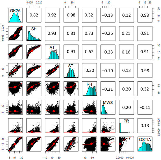 Correlation matrix between variables: bivariate scatter plots below the diagonal, histograms on the diagonal, and the Pearson correlation coefficients above the diagonal. In bivariate scatter plots, the x-axis refers to the variable located at the top of the matrix, and the y-axis refers to the variable located to the right of the matrix (GK2A = GK2A SST (°C), SH = Specific humidity (kg/kg), AT = Air temperature (°C), ST = Skin temperature (°C), RH = Relative humidity (%), MWS = Maximum wind speed (m/s), PR = Precipitation (kg/m2/s), and OSTIA = OSTIA daily SST climatology value (°C)).