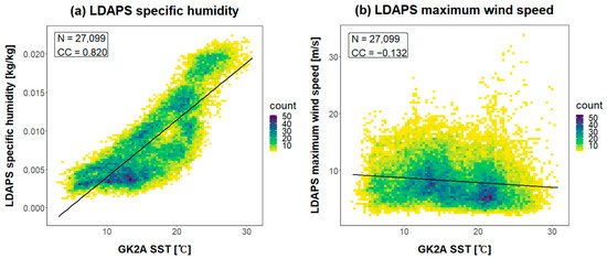 Scatter plot of the relationships between GK2A SST and (a) LDAPS specific humidity, (b) LDAPS maximum wind speed, and (c) OSTIA daily SST climatology value. 27,099 pixels were matched to the in situ measurement points in 2020.