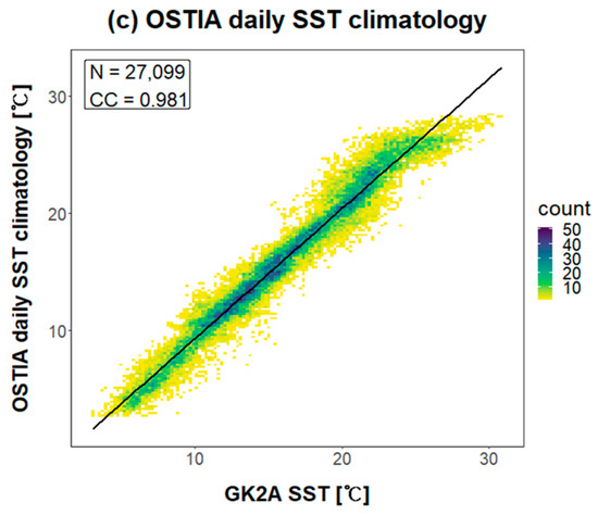 Figure 11 shows the example SST maps before and after outlier detection on 1 June 2020. The color bars for SST in this paper are officially used by KMA. The annual minimum SST of the sea area around the Korean Peninsula is approximately −3 °C, and the maximum SST is approximately 32 °C. So, 35 °C is an extremely high temperature for the study area, and purple was used to distinguish it from the other pixels. Outlier pixels colored in black had quite different values from the neighbor pixels (Figure 11b,d). Most of the outlier pixels were found near the coastline. Because GK2A has a spatial resolution of 2 km, some pixels may have slightly contaminated radiance values, particularly around the complex coastline or near the islands. MODIS and OSTIA SST also have the same problem because of the coarse spatial resolution of 1 km and 0.05°, respectively [47]. In this context, the outlier removal can be essential for the QC of all SST products.