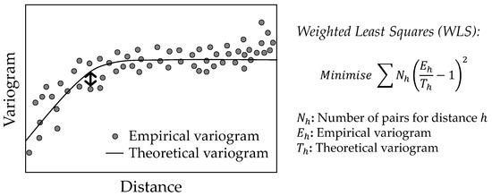 - Cressie, N. Fitting variogram models by weighted least squares. J. Int. Assoc. Math. Geol. 1985, 17, 563–586. [Google Scholar] [CrossRef]