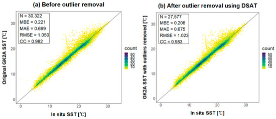 Scatter plots for the in situ and the GK2A SST (a) before outlier removal and (b) after outlier removal using DSAT.