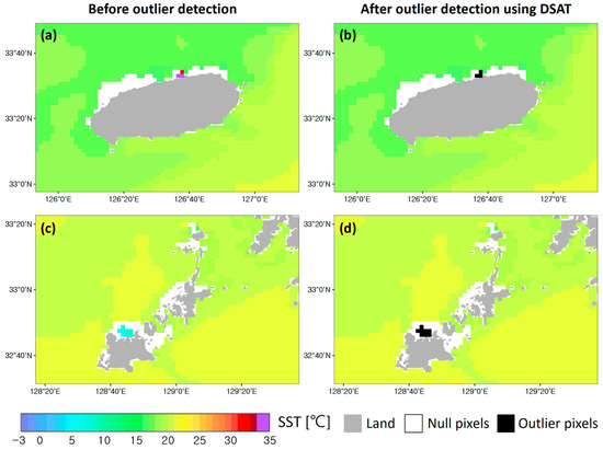 GK2A SST maps before and after outlier detection on 1 June 2020. (a,b): The mean SST of the three outlier pixels is 36.01 °C, whereas the mean SST of the other pixels ( = 322) is 17.18 °C. (c,d): The mean SST of the eight outlier pixels is 6.72 °C, whereas the mean SST of the other pixels ( = 541) is 20.54 °C.