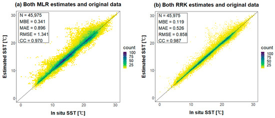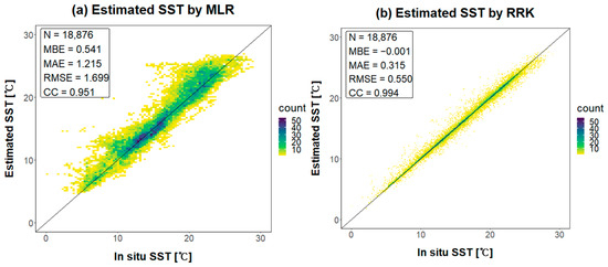 Scatter plots for the in situ SST and estimated SST by (a) MLR, and (b) RRK. The number of validation (N = 18,876) is for the pixels where GK2A had null values, and the in situ measurements existed in 2020.