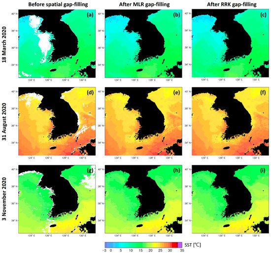 GK2A SST maps before and after the MLR and RRK gap-filling with the example of 18 March, 31 August, and 3 November, 2020. (a,d,g) denote images before spatial gap-filling. (b,e,h) gap-free SST after MLR, and (c,f,i) gap-free SST after RRK.