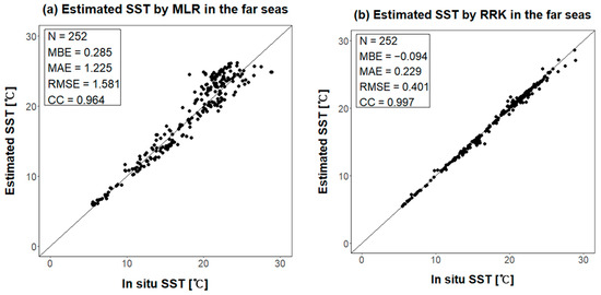 Scatter plots of the (a) MLR and (b) RRK gap-filling using the GK2A SST images with the null pixel ratio less than 0.4 in the far seas (outside 30 km buffer).