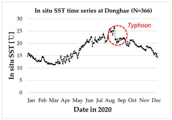 The in situ SST measurements at Donghae in 2020. A sharp decrease from 26.13 °C to 21.52 °C occurred due to typhoons.