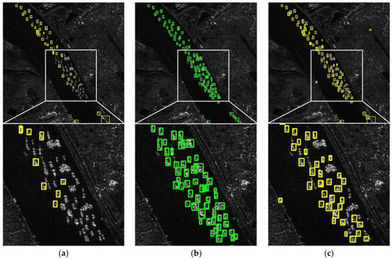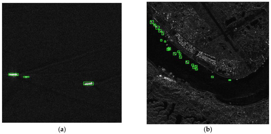 Table 1. The HRSID, including a total of 16,951 ship targets, cuts 136 panoramic SAR images into 5604 images with 800 × 800 pixels. In the LS-SSDD-v1.0 dataset, 15 images with 24,000 × 16,000 pixels are cut into 9000 sub-images, also with 800 × 800 pixels. The LS-SSDD-v1.0 dataset retains the pure background image, so the detection model can learn pure background features more effectively and reduce false alarms. The SAR images in two datasets were collected from Sentinel-1 and TerraSAR-X satellites with mixed HH, HV, VV and VH polarizations. With the help of Google Earth and the Automatic Identification System (AIS), all the ships in a SAR image can be completely labeled. When experimenting, the ratio of dataset division (training dataset:validation set:test set) was set to 13:7:7 and 2:1:1, respectively.