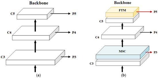 Figure 2b. The MSC and FTM in the backbone CSPDarkNet53 are our designs, while the red lines indicate the new connection between the backbone and the neck. Firstly, several parallel multi-scale convolutions were inserted after the C3 layer. These convolutions help the network to obtain feature information from different reception fields and enhance semantic information. Secondly, after layer C5, in which most of the detailed features were lost, we added a newly designed FTM block, mainly consisting of a multi-headed attention layer and a fully connected layer, to optimize the feature information. Lastly, to improve the effect of feature fusion, we modified the connection between the backbone and the neck. In