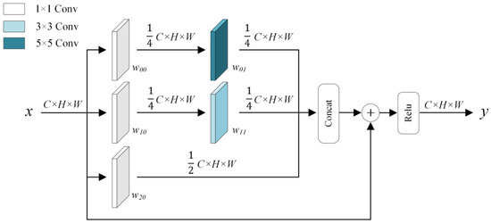Figure 3. MSC is mainly a parallel filter structure, which connects the outputs of convolutions with different kernel sizes into a single output. These parallel convolutions are performed at different scales and can extract features from different receptive fields at the same time, which has two benefits. On the one hand, it improves the feature extraction effect for ships. On the other hand, deeper features can enhance the semantic information of the feature map and improve the model’s ability to detect small ships. These parallel convolution operations occupy a lot of computer resources, so we add 1 × 1 convolution before processing to alleviate the problem. The 1 × 1 convolution can both further increase the network depth and reduce the dimension (changing the number of channels to 0.5, 0.25, and 0.25 times the number of input channels), as well as reduce the computational consumption. However, network widening and deepening induces training difficulties and gradient disappearance problems while improving performance. For this reason, we introduce the ResNet structure, which directly connects the input of MSC with the output of the concatenation operation. Through this design, we process and aggregate the information while limiting the amount of computation, deepen the network while enhancing the expressive ability, and improve the sensitivity of the model to small ships.